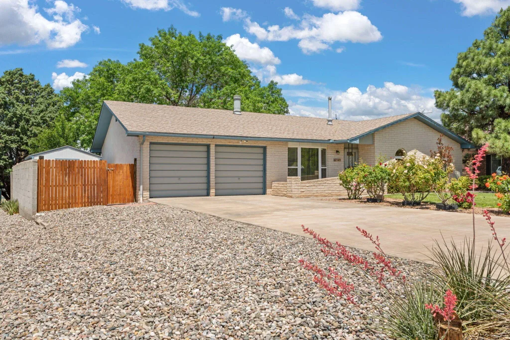 Welcome to this charming single-story home offering 4 spacious bedrooms and views of the Sandia Mountains! The kitchen has ample cabinetry, a tile backsplash, a breakfast nook, a huge pantry area, and a lovely bay window! The primary suite includes double door entry, updated laminate flooring, and a renovated private bath. The secondary bathroom has also been modernized. Improvements include vinyl windows, a garden door and sliding door (installed in 2007), a newer roof and skylights (2012), updated lighting fixtures (2015), and refrigerated air. Step outside to a gorgeous backyard filled with mature fruit trees, grass, a garden, and two storage sheds, both equipped with electricity. Additional perks include a long driveway and side access, offering extra parking or space for toys.