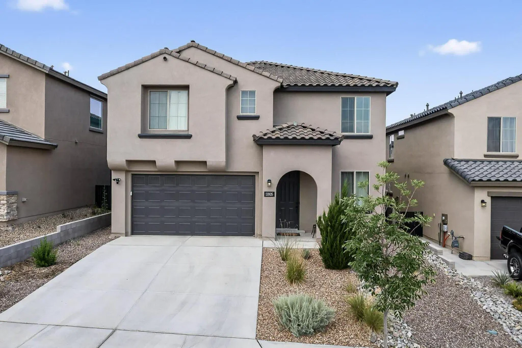 Welcome to 11805 Badger Mountain Trail NW, Albuquerque, NM.Located in the desirable gated Inspiration community, this beautifully maintained home features 4 spacious bedrooms, 2.5 bathrooms, and a 2-car garage. Secondary suite upstairs has its own private bathroom (not shown on floor plan). A versatile flex room offers the perfect space for a home gym, second living area, or potential 5th bedroom.Step inside to tile flooring throughout the main living area, and a stylish kitchen complete with espresso-stained cabinets, granite countertops and stainless steel appliances. With a thoughtful layout and modern finishes, this home is move-in ready!