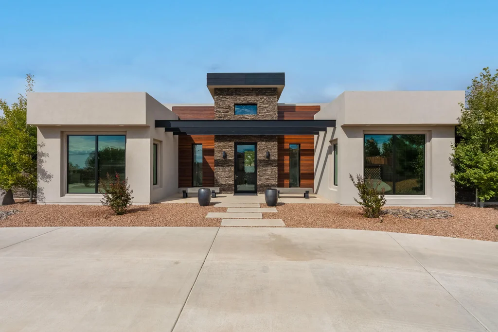 Luxurious lifestyle & sophistication abound in this stunning estate designed with spectacular Sandia Mountain views in mind, featuring chef's kitchen w/ 2 dishwashers & sinks plus private butler's pantry. Each detail was thoughtfully placed for elevated daily living and seamless entertaining. Tasteful additions include soaring ceilings, home theater, private office & fireplace. Distinctive touches in serene primary suite include: modern gas fireplace, spa-like freestanding tub, & boutique style custom closet. Retractable glass doors open to an outdoor paradise with an expansive patio as well as an exquisite pool and spa. Relax around the fire pit after an invigorating swim. Memories are here for the making! 5 car garage has 2 interior storage closets as well as a dog wash station.